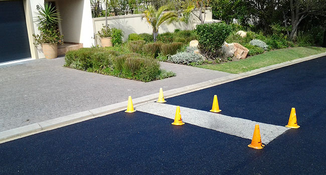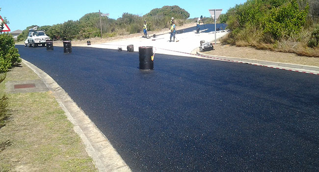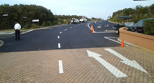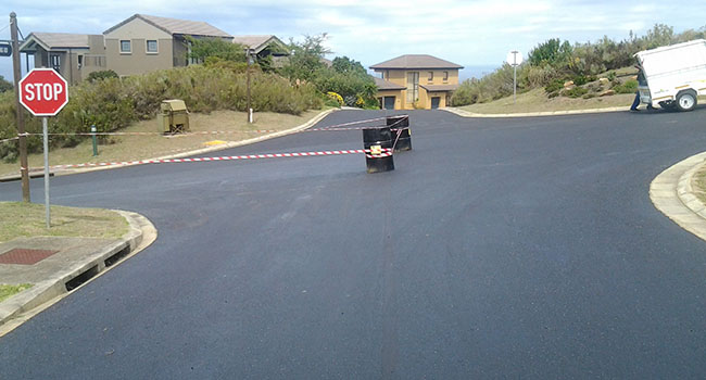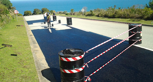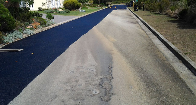 Typical section of road at Pezula Golf Estate before we sterted. Due to good management and the timeios intervention by the estate management the degradation in the quality of the road surface was stopped in time and at a fraction of the cost of new asphalt at a later stage. Millions of rands saved by rejuvenating at the right time