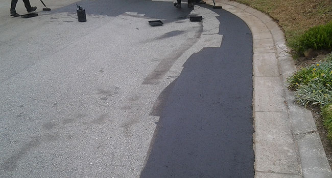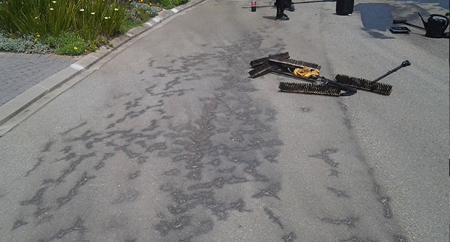 The same road during start of the rejuvenetion process. You can once again see how carefull we are with the curbs. We pride ourselves on not leaving one bitumen footprint or any bitumen spills on any curbs were we are working. This is part of our winning reciepe and why we are recommended as the top rejuvenation applicators in South Africa